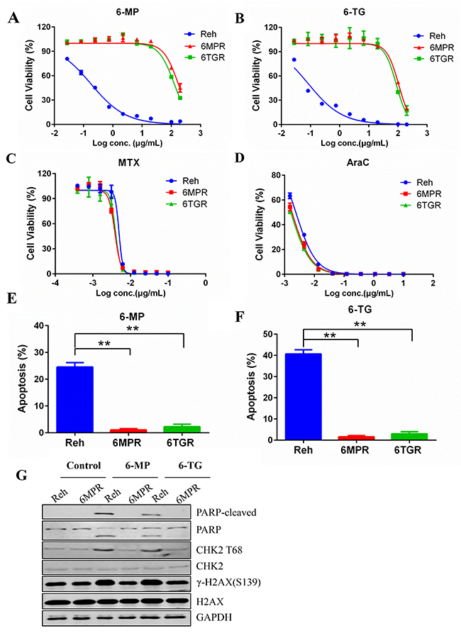 Figure 1: Establishment of the thiopurine resistant cell lines Reh-6MPR and Reh-6TGR. (A, B, C and D) Drug sensitivity of 6-MP, 6-TG, MTX and AraC were analyzed with Cell TiterGlo assay. (E, F) Apoptosis induced by 6-MP and 6-TG was analyzed with annexin V-PE apoptosis detection Kit. Data are expressed as mean ± SD. **P<0.01 compared with ctrl Reh group. (G) Western blot of DDR markers (PARP-cleaved, P-CHK2 and γ-H2AX).