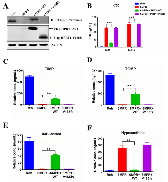 Figure 4: HPRT1-wt can reverse the resistance in Reh-6MPR cells. (A) The expression levels of HRPT1 were detected by western blot. (B) 6-MP and 6-TG IC50 values of Reh-6MPR cells and HPRT1 re-expression cells. Data are expressed as mean ± SD. ***P<0.001 compared with ctrl Reh group. (C, D, E, F) The TIMP, TGMP, labeled-IMP and hypoxanthine were measured in Reh-6MPR cells and HPRT1 re-expression cells by LC-MS. Data are expressed as mean ± SD. **P<0.01 compared with ctrl Reh group.