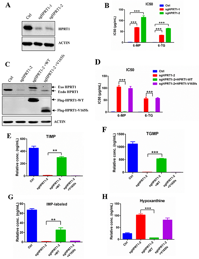Figure 5: Knockdown HPRT1 induce thiopurine resistance. (A) Western blot of HPRT1 in the knockdown cells. (B) 6-MP and 6-TG IC50 values of HPRT1 knockdown cells. Data are expressed as mean ± SD. ***P<0.001 compared with ctrl Reh group. (C) The expression levels of endogenous and exogenous HRPT1 were detected by western blot. (D) 6-MP and 6-TG IC50 values of knockdown cells with HPRT1 re-expression. Data are expressed as mean ± SD. ***P<0.001 compared with ctrl Reh group. (E, F, G, H) The TIMP, TGMP, labeled-IMP and hypoxanthine were measured in HPRT1 knockdown cells and HPRT1 re-expression cells by LC-MS. Data are expressed as mean ± SD. ***P<0.001, **P<0.05 compared with ctrl Reh group.
