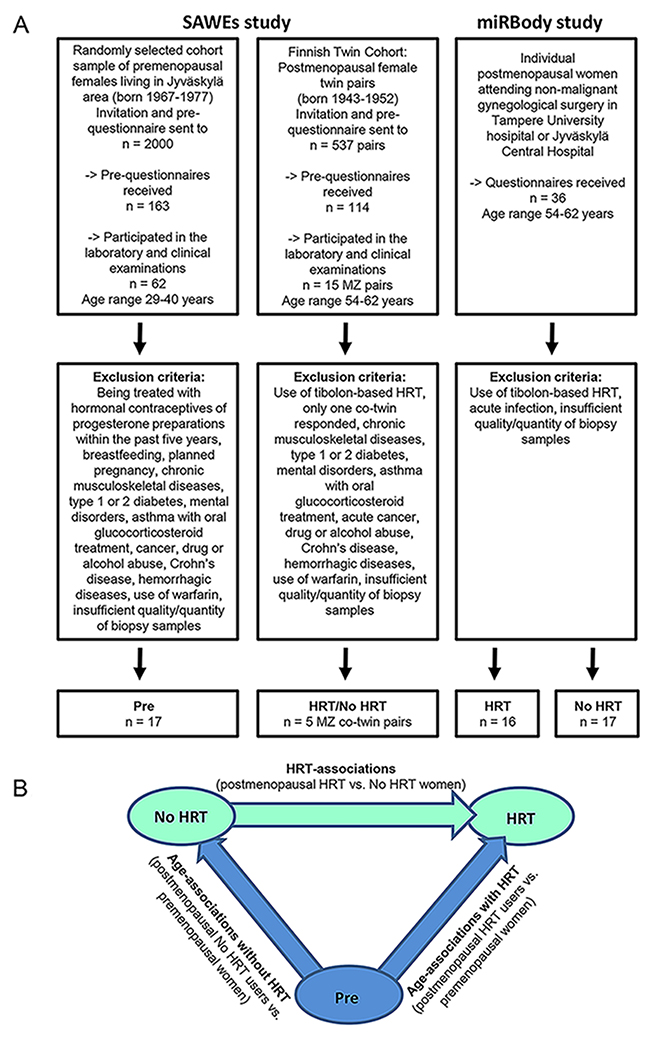 Two different samples and data sets originating from 1) the SAWEs and 2) miRBody studies were analyzed (Figure 1A). The SAWEs study consists of a cross-sectional design with premenopausal women (Pre) without any E2-containing hormonal treatments, and a co-twin design of postmenopausal MZ twin sister pairs with approximately 7 years of E2-based HRT discordance (HRT and No HRT users), i.e. one sister was a current HRT user and the other had never used HRT. MiRBody is a cross-sectional study with a postmenopausal cohort of unrelated women who were age-matched with the SAWEs MZ twins and formed two groups, one using and the other not using HRT. The SAWEs samples were miR- profiled. The miRBody samples (postmenopausal HRT and No HRT women) and SAWEs samples (premenopausal women) were available for the validation of the profiling data. Figure 1B shows the scheme of comparisons among the identified three groups.