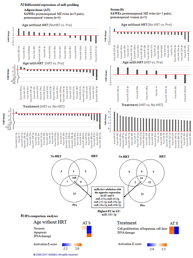 Figure 2: MiR profiling of adipose tissue and serum-derived miRs. (A) Discovery phase of the miRs performed on arrays for both tissues (FC ≥ ±1.9). Numerical FC values for the comparisons are specified as supplementary data (Supplementary Table 2). All the comparisons, i.e. No HRT vs Pre, HRT vs Pre, HRT vs No HRT, were taken into account in both 10 adipose tissue (on left) and 13 blood serum samples (on the right). Venn diagram presents the numbers of all the detected miRs and those chosen for RT-qPCR validation. (B) IPA comparison analyses were performed between adipose tissue and serum miRs in each comparison (FC ≥ ±1.9, Z-activation score ≥ ± 2.0). Results show the differences between the two tissues in terms of diseases and biological functions. Orange indicates up- and blue downregulation.