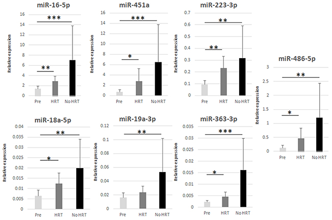 Figure 3: RT-qPCR validation of selected miRs in adipose tissue. * p < 0.05, ** p < 0.01, *** p < 0.001. Pre = premenopausal women (n=12), HRT = postmenopausal HRT users (n=9), No HRT = postmenopausal non-users (n=12). Results are shown as mean ± SD. Data were normalized by RNU44 expression levels.