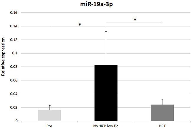 Figure 4: RT-qPCR validation of miR-19a-3p in adipose tissue. Relative expression of miR-19a-3p in all the groups considering No HRT women with low E2 level (53.6-99.1 pmol/l) * p < 0.05, Pre = premenopausal women (n=12), HRT = postmenopausal HRT users (n=9), No HRT = postmenopausal non-users (n= 6). Results are shown as mean ± SD. Data were normalized by RNU44 expression levels.