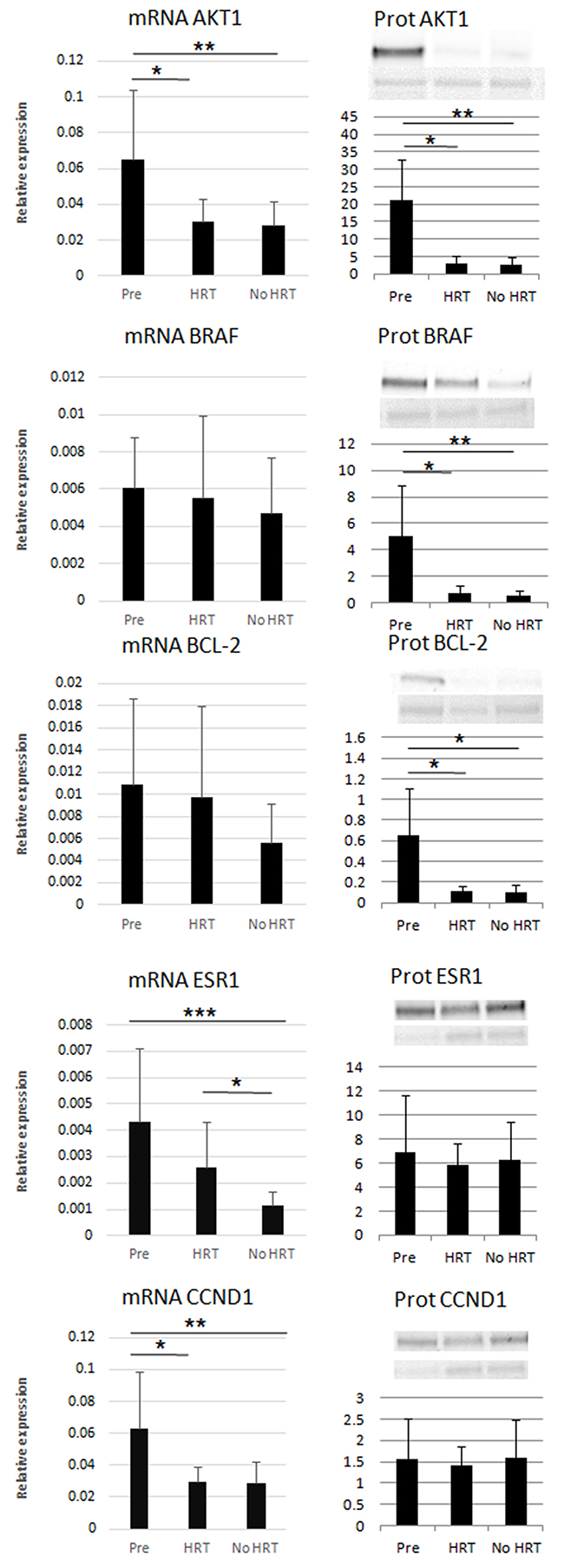 Figure 7: Relative mRNA expression and protein levels of the miR targets. * p < 0.05, ** p < 0.01, *** p < 0.001. Pre = premenopausal women (nmRNA=12, nprot=5), HRT = postmenopausal HRT users (nmRNA=9, nprot=5), No HRT = postmenopausal non-users (nmRNA=12, nprot=5). Results are shown as mean ± SD. In the left column mRNAs and in the right column protein data are reported. mRNA data were normalized against GADPH expression levels. In the right column, the upper western blots show the investigated proteins and the lower blots show the Ponceau dye (60 kDa) used for normalization procedure.