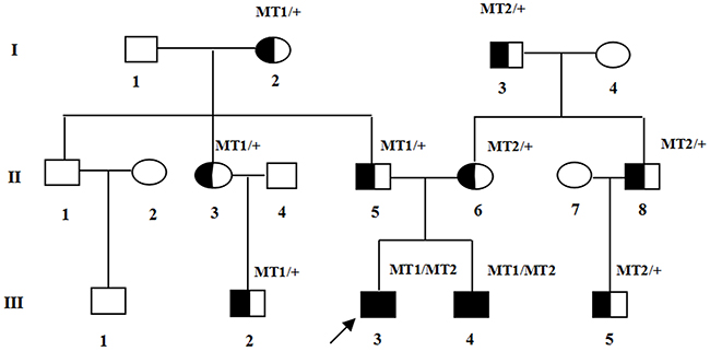 Figure 1: Pedigree of the family with USH1. Normal males and female are shown with empty squares and circle, respectively. Affected patient is shown with filled symbols. The proband (III:3) is indicated by arrow. MT: mutant type. MT1: c.5168+1G>A; MT2: c.6070C>T (p.R2024X).
