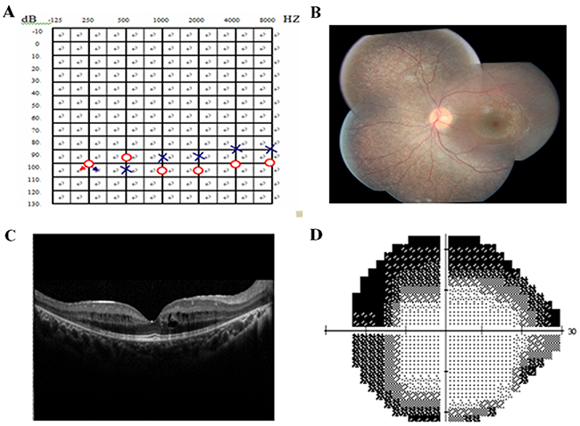 Figure 2: Pure tone audiogram, fundus photography, optical coherence tomography (OCT), and visual field of the proband. (A) Audiogram showed bilateral profound sensorineural hearing loss of proband III: 4(red, right ear; blue, left ear). (B) Fundus photography showed atrophy of the retinal pigment epithelium, attenuation of retinal arterioles, pallor of optic disc and bone-spicule pigmentation in the retinal periphery. (C) OCT revealed cystoid macular oedema, macular retinoschisis and thinned retina in proband. (D) Bilateral vision field got concentric narrowing, for the residual central visual field were 10-20 degrees. The extent of visual field ranged from 10° to 20°.