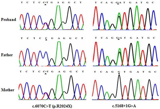 In conclusion, we determined that the compound heterozygous mutations, c.6070C>T (p.R2024X) and c.5168+1G>A, could result in USH1 in a Chinese family. Our finding expands the spectrum of clinical phenotypes of mutations, which can help us better understand the genotype-phenotype relationship in this disease, and provides the potential for early molecular diagnoses, accurate genetic counseling, and optimal rehabilitation.