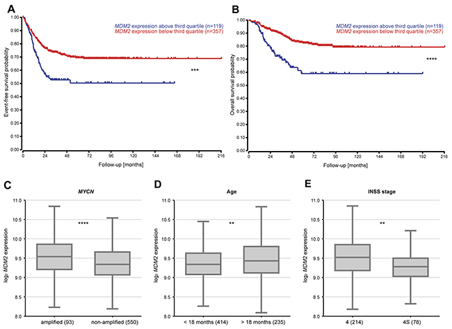 Figure 1: Elevated MDM2 expression levels in tumors are associated with poor patient overall and event-free survival as well as more aggressive neuroblastomas. (A-B) Tumors from a cohort of 476 primary tumors were classified into high- or low-expressing groups according to whether MDM2 expression was greater or lower than the third quartile MDM2 expression. Kaplan–Meier analysis of overall and event-free patient survival. (C-E) Association of MDM2 expression with prognostic markers (MYCN status, age, INSS stage) in 649 primary tumors. ** = P < 0.01, *** = P < 0.001, **** = P < 0.0001.