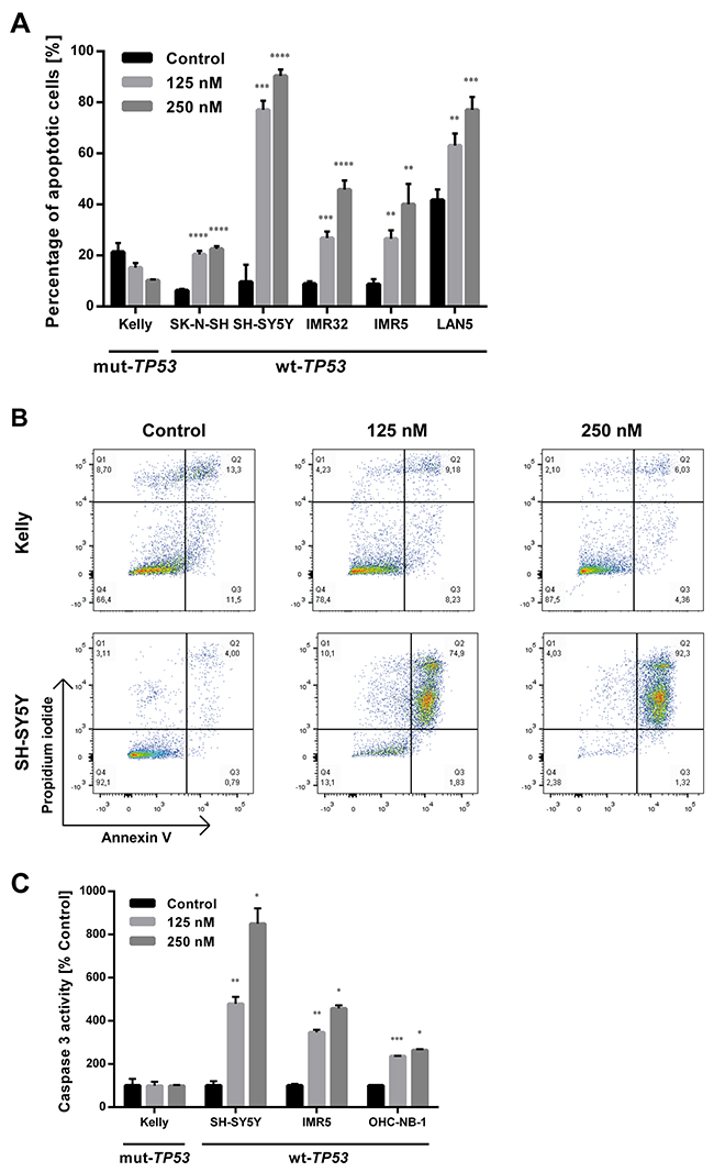 Figure 4: DS-3032b treatment selectively induces apoptosis in neuroblastoma cells with wildtype TP53. (A) Fraction of early (annexin V positive, propidium iodide (PI) negative) and late apoptotic cells (annexin V and PI positive) was increased by DS-3032b exposure in a dose-dependent manner in neuroblastoma cell lines harboring wildtype TP53, in contrast to the TP53 mutant cell line Kelly. (B) Exemplary dot-plots of the neuroblastoma cell lines Kelly and SH-SY5Y after DS-3032b treatment showing an induction of double-positive cells (annexin V and PI positive) in cells with wildtype TP53, but not in cells with mutated TP53. (C) DS-3032b exposure increased caspase 3 activity in neuroblastoma cell lines (SH-SY5Y and IMR5) and primary neuroblastoma cells (OHC-NB-1) that harbor wildtype TP53, in contrast to Kelly cells. Data represent mean values and SD (n = 3 per group). * = P < 0.05, ** = P < 0.01, *** = P < 0.001, **** = P < 0.0001.