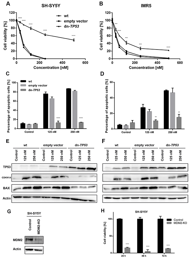 Figure 5: Stable, ectopic expression of dominant-negative TP53 (dn-TP53) attenuates antiproliferative and pro-apoptotic activity of DS-3032b, and CRISPR-mediated MDM2 knockout (KO) mimics DS-3032b treatment. (A-D) Transfection with a plasmid encoding dn-TP53 rescued SH-SY5Y and IMR5 cells from DS-3032b mediated viability inhibition and apoptosis induction. (E-F) Basal level of TP53 in SH-SY5Y and IMR5 cells were increased by dn-TP53 transfection, but not by transfection with an empty control vector. DS-3032b mediated induction of CDKN1A and BAX expression was attenuated in dn-TP53 expressing SH-SY5Y and IMR5 cells. (G-H) MDM2 knockout was performed using CRISPR vectors (GFP-tagged) and resulted in cell viability inhibition of SH-SY5Y cells. Fluorescence activated cell sorting for GFP-expressing cells was done 24 h after transfection. Cell viability (XTT assay) was measured 24, 48 and 72 h after sorting, and cells were harvested for western blotting 7 days after sorting. Data represent mean values and SD (n = 3 per group). ** = P < 0.01, *** = P < 0.001, **** = P < 0.0001.