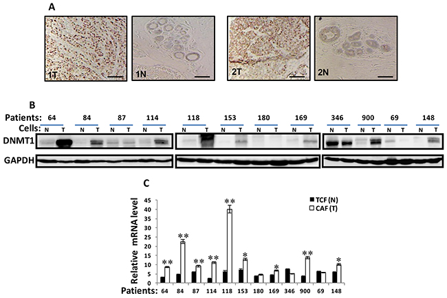 Figure 1: DNMTl is upregulated in CAFs versus TCFs. (A) Formalin-fixed paraffin-embedded sections of breast resection specimens from 10 patients encompassing both invasive ductal carcinoma and their corresponding histologically normal adjacent tissues were utilized for immunohistochemical analysis using anti-DNMTI antibody. Zeiss Axio microscope was utilized, scale bar = 50 μM. (B) Whole-cell lysates were prepared from the indicated cells and were used for immunoblotting analysis, CAFs (T), TCFs (N). GAPDH was used as internal control. (C). Total RNA was extracted and the level of the DNMT1 mRNA was assessed by qRT-PCR. Error bars represent mean ± S.D (n=3). *, P< 0.05; **, P<0.001.