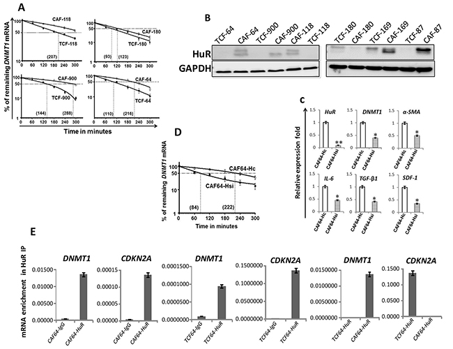 Figure 2: DNMTl upregulation in CAFs is mediated through HuR-dependent stabilization. (A) and (D) Exponentially growing cells were treated with actinomycin D (5 μg/ml) for various periods of time, and total RNA was extracted and the level of the DNMT1 mRNA was assessed using qRT-PCR. The values were determined and normalized against GAPDH. Graphs show the proportion of the DNMT1 mRNA remaining post-treatment, and the dotted lines indicate the DNMT1 mRNA half life, the corresponding values are in brackets. Error bars indicate mean ± S.D (n=3). (B) Whole-cell lysates were prepared from the indicated cells, and used for imrnunoblotting analysis. (C) Total RNA was extracted from CAF-64 cells expressing either HuR-siRNA (CAF64-Hsi) or control siRNA (CAF64-Hc), and the levels of the indicated genes were assessed by qRT-PCR and normalized against GAPDH. Error bars represent mean ± S.D. *, P< 0.05; **, P= 0.00066. (E) Whole cell lysates were prepared from CAF/TCF-64 cells, and then RNAs bound to the HuR protein were isolated by immunoprecipitation using anti-HuR antibody (CAF64-HuR and TCF64-HuR, respectively) or anti-lgG (CAF64-IgG and TCF64-IgG, respectively), and then the mRNAs of the indicated genes were amplified by qRT-PCR. Data were normalized to the levels of the highly abundant GAPDH mRNA in each IP sample and represented as the enrichment of each mRNA. Error bars indicate mean ± S.D (n=3).