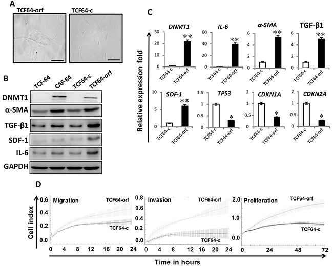 Figure 3: Ectopic expression of DNMT1 activates breast stromal fibroblasts. TCF-64 cells were transfected with a plasmid bearing the DNMT1 ORF (TCF64-orf) or an empty vector (TCF64-c). (A) Phase contrast images of cells several days post-transfection. Fluid Cell Imaging Station was utilized, scale bar = 50 μM. (B) Whole-cell lysates were prepared from the indicated cells, and were used for immunoblotting analysis using antibodies against the indicated proteins. (C) Total RNA was extracted and the mRNA levels of the indicated genes were assessed using qRT-PCR. Error bars represent mean ± S.D (n=3). *, P<0.05; **, P<0.003. (D) Exponentially growing cells (104) were added independently into the 16-well CIM-plates (invasion/migration) or to the E-plate (proliferation), and cell invasion, migration and proliferation were assessed using the RTCA-DP xCELLigence System. Data are representative of different experiments performed in triplicate.