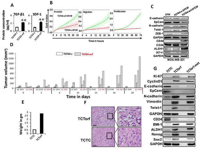 Figure 4: Ectopic expression of DNMT1 enhances the paracrine procarcinogenic effects of breast stromal fibroblasts in vitro and in vivo. (A) SFCM from the indicated cells were collected after 24 h and the levels of the indicated proteins were determined by ELISA and were presented in the respective histograms. Error bars indicate mean±S.D. **, P<0.001 (n=3). (B) MDA-MB-231 cells were seeded in the presence of SFCM from TCF64-orf (TCF64-orf-SFCM) or TCF64-c (TCF64-c-SFCM) cells, and then the migration, invasion and proliferation abilities were assessed by the real time RTCA-DP xCELLigence System. Data are representative of different experiments performed in triplicate. (C) Whole cell lysates were prepared from MDA-MB-231 cells treated as indicated and were used for immunoblotting using the indicated antibodies. (D) Orthotopic breast cancer xenografts were created by co-injecting MDA-MB-231 cells with TCF64-orf or TCF64-c cells (n=5) under the nipple of nude mice. The histogram shows the volumes of xenograft tumors that were measured at the indicated time points. (E) Orthotopic tumors bearing TCF64-orf cells (TCTorf) or TCF64-c cells (TCTC) were excised and weighted. (F) Excised tissues were subjected to hematoxylin and eosin staining. Olympus BX53 microscope was utilized, low magnification (left); scale bar = 25 μM. High maginification (right). (G) TCTorf, TCF64-c as well as metastatic (TCTorf-met) tumors were excised and whole cell lysates were prepared and protein levels were assessed by immunoblotting using antibodies against the indicated proteins.