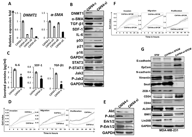 Figure 5: DNMT1 downregulation suppresses myofibroblasts. CAF-64 cells were transfected with 3 different DNMT1-siRNA sequences (A), (B) and (C) (CAF64-si) and a scrambled sequence was used as control (CAF64-c). (A) Total RNA was extracted and used for qRT-PCR. Error bars represent mean ± S.D. (B) and (E) Whole-cell lysates were prepared from CAF64si and CAF64-c, and then were used for immunoblotting analysis using specific antibodies against the indicated proteins. (C) SFCM from the indicated cells were collected after 24 h and the levels of the indicated proteins were determined by ELISA and were presented in the respective histograms. Error bars indicate mean ± S.D (n=3). *, P<0.05. (D) Exponentially growing cells were seeded, and cell invasion, migration and proliferation were assessed using the RTCA-DP xCELLigence System. Data are representative of different experiments performed in triplicate. (F) MDA-MB-231 cells were seeded in the presence of SFCM from CAF64-si (CAF64-si-SFCM) or CAF64-c (CAF64-c-SFCM) cells, and then the migration, invasion and proliferation abilities were assessed by the real time RTCA-DP xCELLigence System. Data are representative of different experiments performed in triplicate. (G) Whole cell lysates were prepared from MDA-MB-231 cells treated as indicated and were used for immunoblotting using the indicated antibodies.