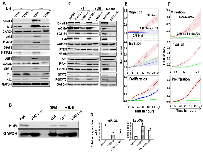 Figure 6: DNMTl knockdown persistently inhibits the pro-inflammatory/carcinogenic IL-6-related loop and CAF cells. (A) TCF64-si and TCF64-c cells were either sham-treated or exposed to IL-6 (35 ng/mL), and then whole cell lysates were prepared and were used for immunoblotting using specific antibodies for the indicated proteins. (B) TCF-64 cells were transfected with STAT3-siRNA (STAT3si) or control siRNA (Ctrl), and then cells were either sham-treated or exposed to IL-6 (3.5 ng/mL), and then the expression of the HuR protein was assessed by immunoblotting. (C) CAF64-si and CAF64-c cells were cultured for 48 h, and then the medium-containing DNMTl-siRNA or a scrambled sequence was removed and replaced with fresh medium for 48 h (48 h). Cells were splited (split), and then splited 6 more times (S-split). Whole-cell lysates were prepared from the indicated cells and were used for immunoblotting analysis using specific antibodies against the indicated proteins. (D) Total RNA was extracted, and U6 was used as internal control and the mature miRNA levels were assessed using qRT-PCR. Error bars represent mean ± S.D (n=3). *, P<0.02. (E) Migration, invasion and proliferation abilities of the indicated cells were analyzed by the real time RTCA-DP xCELLigence System. (F) MDA-MB-231 cells were seeded with the indicated SFCM, and then migration, invasion and proliferation abilities were analyzed by the real time RTCA-DP xCELLigence System. Data are representative of different experiments performed in triplicate.