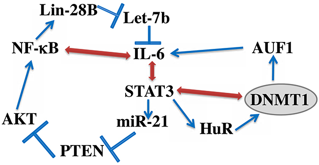 Moreover, we have shown that DNMT1 activates STAT3, which suggests the presence of a positive feedback loop between STAT3 and DNMT1 (Figure 8). DNMT1-dependent activation of STAT3 could be mediated through JAK2 and IL-6 since DNMT1 activated both proteins. There is also physical association between STAT3 and DNMT1, which is crucial for DNA methylation [26, 27].