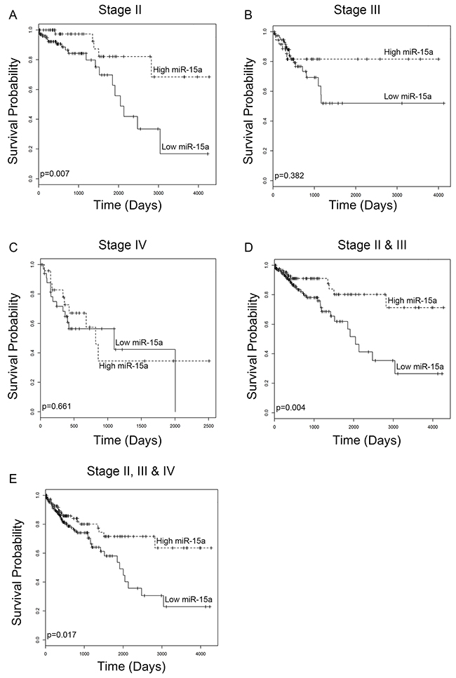 Figure 1: miR-15a expression analysis from TCGA database. Low expression of miR-15a correlates with worse patient survival for patients with stage II colon cancer (A) (p=0.007). Low expression associates with worse survival for patients with stage III colon cancer, however the difference is not statistically significant (B) (p=0.382). There is no correlation between miR-15a expression and survival of patients with stage IV cancer (C) (p=0.661). Low expression of miR-15a correlates with decreased survival for combined analysis of stage II & III patients (D) (p=0.004) as well as stage II, III & IV patients (E) (p=0.017).