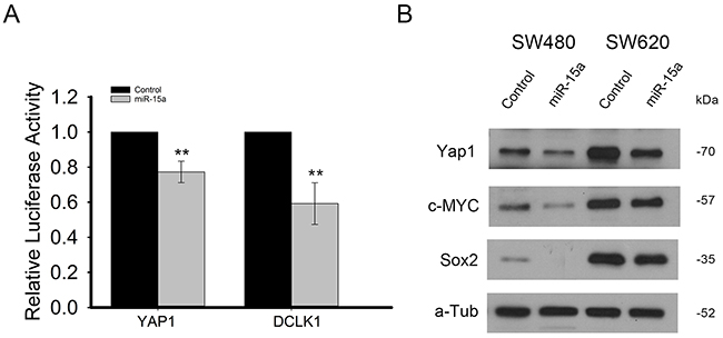 Figure 3: miR-15a directly targets YAP1 and DCLK1 and inhibits expression of genes downstream of YAP1. Luciferase reporter assay in HCT116 cells, demonstrates that miR-15a expression can decrease luciferase expression by reporter vectors including binding sites for miR-15a from the YAP1 and DCLK1 3’UTRs, indicating direct targeting of YAP1 and DCLK1 by miR-15a (A). miR-15a expression reduced protein expression of downstream targets of YAP, c-MYC as well as SOX2 in SW480 and SW620 cell lines (B). (** p ≤ 0.01).
