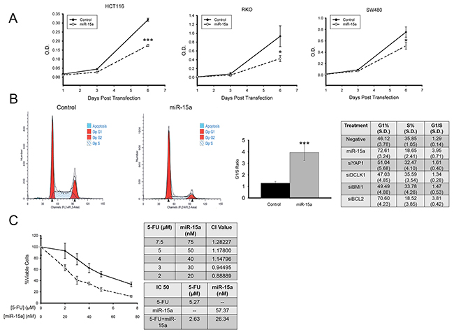 Figure 4: miR-15a inhibits colon cancer proliferation, and increases sensitivity to 5-Fu. miR-15a reduces colon cancer cell proliferation measured by WST-1 assay in 3 colon cancer cell lines, HCT116, RKO, SW480 (A). miR-15a expression induces cell cycle arrest in HCT116 colon cancer cells. Representative flow cytometry patterns for cells transfected with control or miR-15a and the effects of miR-15a and siRNA against its target genes on G1%, S-Phase % and G1/S ratio are shown (B). miR-15a expression increases sensitivity to 5-FU in HCT116 colon cancer cells. CI values calculated for miR-15a and 5-FU indicate at low concentrations they have a slight synergistic effect. In combination, the IC50 of 5-FU was reduced from 5.27 to 2.63 μM, and the IC50 of miR-15a was reduced from 57.37 to 26.34 nM (C). (* p ≤ 0.05, *** p ≤ 0.001).
