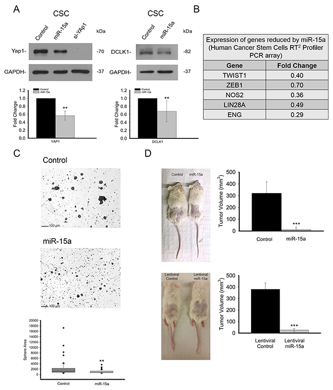 Figure 5: miR-15a is effective in spheroid growing stem like HCT116 colon cancer cells and inhibits tumor formation in vivo. In spheroid growing cells, expression of miR-15a also reduces expression of YAP1 and DCLK1 (A). A PCR array looking at cancer stem cell related genes indicates that miR-15a expression leads to changes in a group of cancer stem cell related genes including TWIST1 and ZEB1 (B). miR-15a expression inhibits the ability of these cells to form spheres and sphere size was quantified (C). miR-15a expression by transient transfection prior to tumor implantation (top), or stably via lentiviral vector (bottom) drastically reduces tumor formation and growth in NOD/SCID mice (D). (** p ≤ 0.01, *** p ≤ 0.001).
