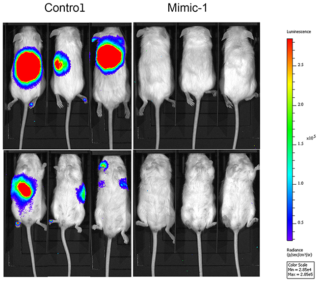 For the impact of Mimic-1 in colon cancer metastasis studies, mouse tumors were established via tail vein injection (2 x 106) cells with HCT116 cells expressing luciferase reporter. Two weeks after injection, mice were treated via tail vein injection with 40 μg of control miRNA or Mimic-1 packaged using in vivo-jetPEI (Polyplus Transfection) or with 50 mg/kg of 5-FU (Sigma Aldrich). Mice were treated every other day for 2 weeks (8 times). Following treatment, mice were screened using IVIS Spectrum In vivo Imaging System (IVIS) (PerkinElmer). 5-FU treated mice were not imaged as they died from 5-FU toxicity (n=5).