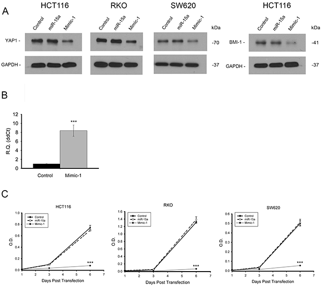 Figure 8: Vehicle free delivery of Mimic-1 in vitro. Mimic-1, when delivered without transfection reagents into colon cancer cells reduced protein expression of targets YAP1 and BMI1 (A). qRT-PCR confirmed that miR-15a was entering HCT116 cells without transfection reagents (B). In the absence of transfection reagents, Mimic-1 maintains its ability to decrease colon cancer cell proliferation, (HCT116, RKO and SW620) while unmodified miR-15a has no effect on cell proliferation (C). (*** p ≤ 0.001).