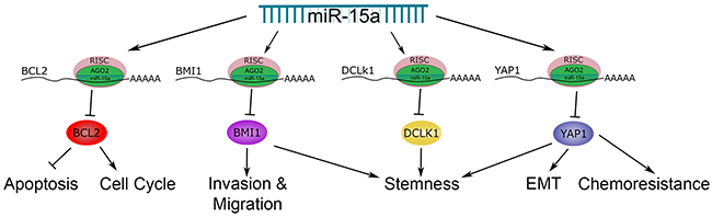 Figure 9: The role of miR-15a in colon cancer. This schematic highlights the target genes of miR-15a, BCL2, BMI1, DCLK1 and YAP1 that we have investigated and the roles they play in colon cancer.