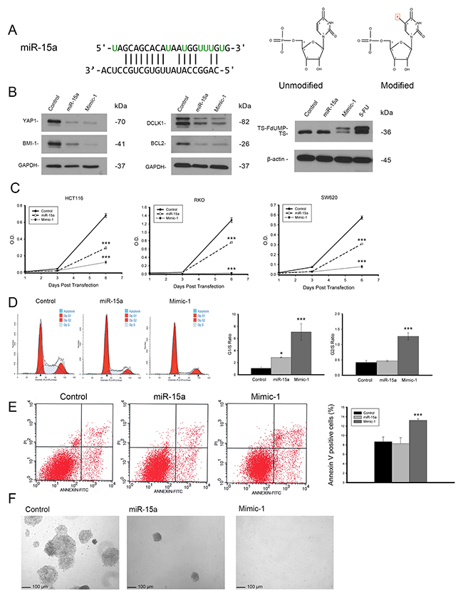 Figure 6: Modified miR-15a mimic is more potent than miR-15a and retains target specificity. Modified miR-15a mimic, Mimic-1 was made in which all uracils in miR-15a were replaced with 5-FU. The structure of unmodified uracil vs 5-FU is shown (A). Mimic-1 was shown to maintain the ability to regulate protein expression of miR-15a targets and also act as 5-FU shown by the presence of TS-FdUMP (B). Mimic-1 showed enhanced ability to inhibit colon cancer cell (HCT116, RKO and SW620) proliferation compared to unmodified miR-15a (C). Mimic-1 also induced enhanced cell cycle arrest compared to unmodified miR-15a as shown by increased G1/S ratio (D). Mimic-1 induced a 1.5 fold increase in apoptotic cells compared to control treated HCT116 cells based on Annexin V staining (E). In spheroid growing HCT116 cells, unmodified miR-15a inhibited colony formation in 3D Matrigel matrix, while Mimic-1 prevented colony formation completely (F). (** p ≤ 0.01, *** p ≤ 0.001).
