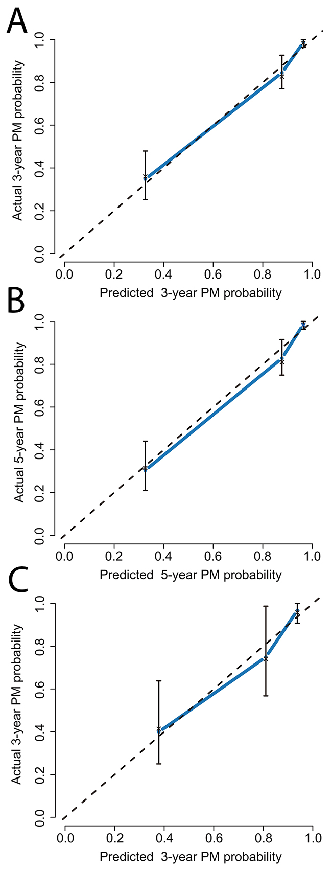 Figure 2: The calibration curve analysis for PM prediction. (A) 3 years after LT in the primary cohort; (B) 5 years after LT in primary cohort; (C) 3 years after LT in the validation cohort.