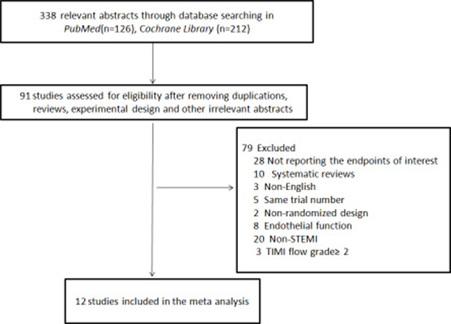 We searched Pubmed, MEDLINE and Cochrane library databases and identified 338potential studies after excluding articles that were duplications, reviews, experimental designs, and other irrelevant contents (Figure 1). We further excluded 79 studies that were systematic reviews (n = 10), non-English reports (n = 3), had same trial numbers (n = 5), were non-RCT (n = 2), and endothelial trials (n = 8), studied STEMI patients with Thrombolysis in myocardial infarction (TIMI) flow grade ≥ 2 (n = 3), and non-STEMI patients (n = 20) and for not reporting the primary endpoints of interest (n = 28).Finally, we included 12 trials [13, 14, 21–30]with 1069STEMI patients(LPoC, (n = 920; RPoC, (n = 149)undergoing cMRI assessment after percutaneous coronary intervention (PCI) (Figure 1).
