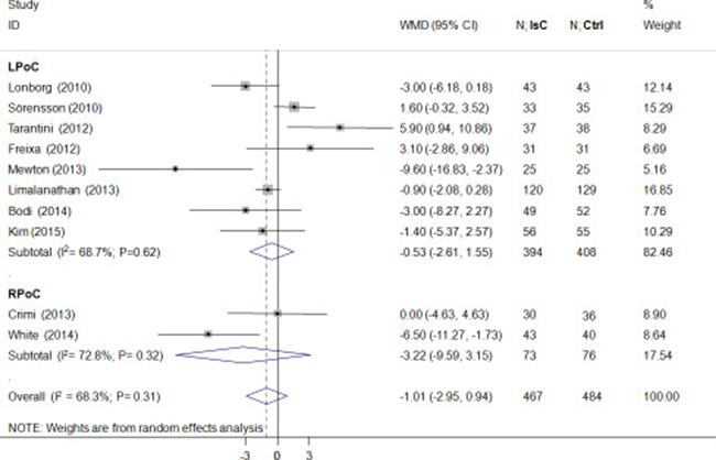 Figure 2: Effects of local and remote ischemic postcondtioning on final infarction size. Histogram plots showing final infarction sizes(IS; percentage of left ventricle) in STEMI patients that underwent LPoC and RPoC relative to controls. As shown, ischemic postconditioning (PoC) did not improve IS(weighted mean difference(WMD) = –1.01; P = 0.31). Note: LPoC, local ischemic postconditioning; RPoC, remote ischemic postconditioning; PoC, ischemic postconditioning ; Ctrl, control.