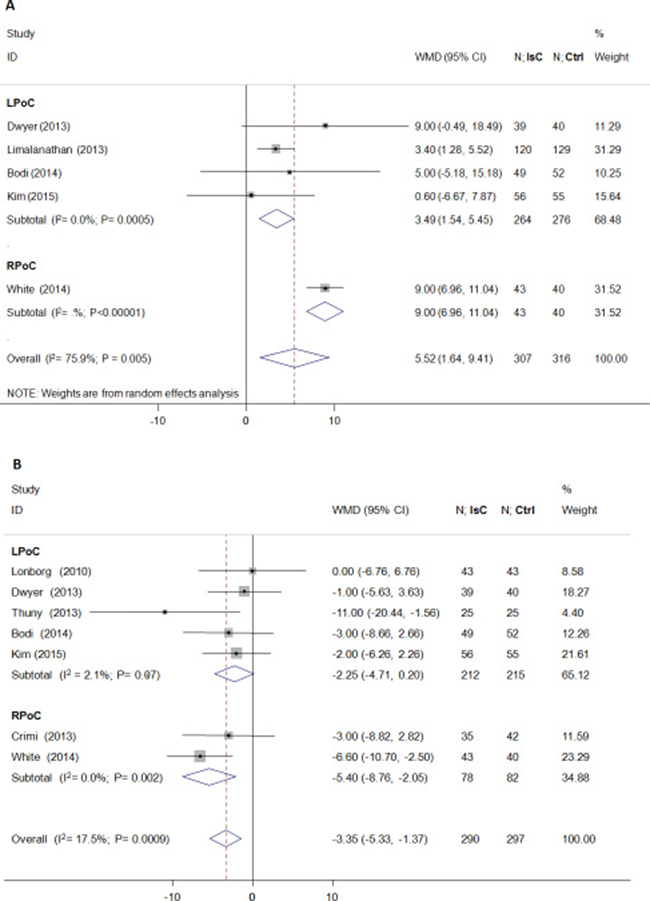 As shown in Figure 2, the final IS(%) was not significantly reduced by PoC (weighted mean difference [WMD] = –1.01; 95% CI: –2.95 to 0.94; P > 0.05) and demonstrated heterogeneity (I2 = 68.0%). Both LPoC and RPoC increased the potential of MSI(%)(WMD = 5.52; 95% CI: 1.64 to 9.41; P = 0.005; I2 = 76.0%; Figure 3A). Patients treated by LPoC (WMD = –2.25; 95% CI: –4.71 to 0.20; P = 0.07; I2 = 2.0%), or RPoC (WMD = –5.40; 95% CI: –8.76 to –2.05; P = 0.002; I2 = 0.0%) showed decreased percent myocardial edema (Figure 3B).