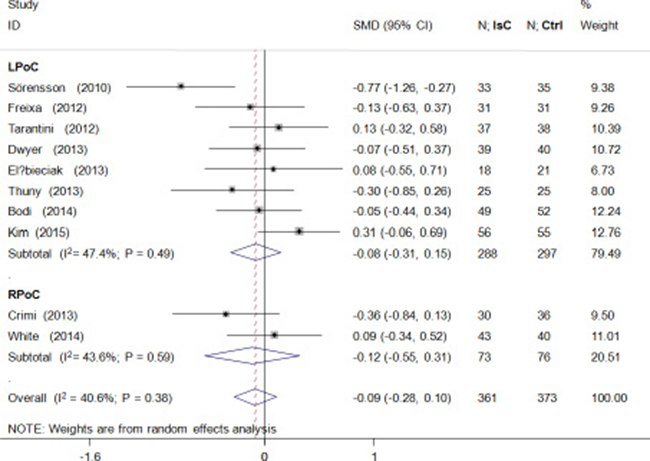 Figure 4: Effects of local and remote ischemic postcondtioning on left ventricular volume. Histogram plots show that LPoC and RPoC did not reduce left ventricular volume (standardized mean difference(SMD) = –0.09; P = 0.38) in STEMI patients that underwent LPoC and RPoC relative to controls.