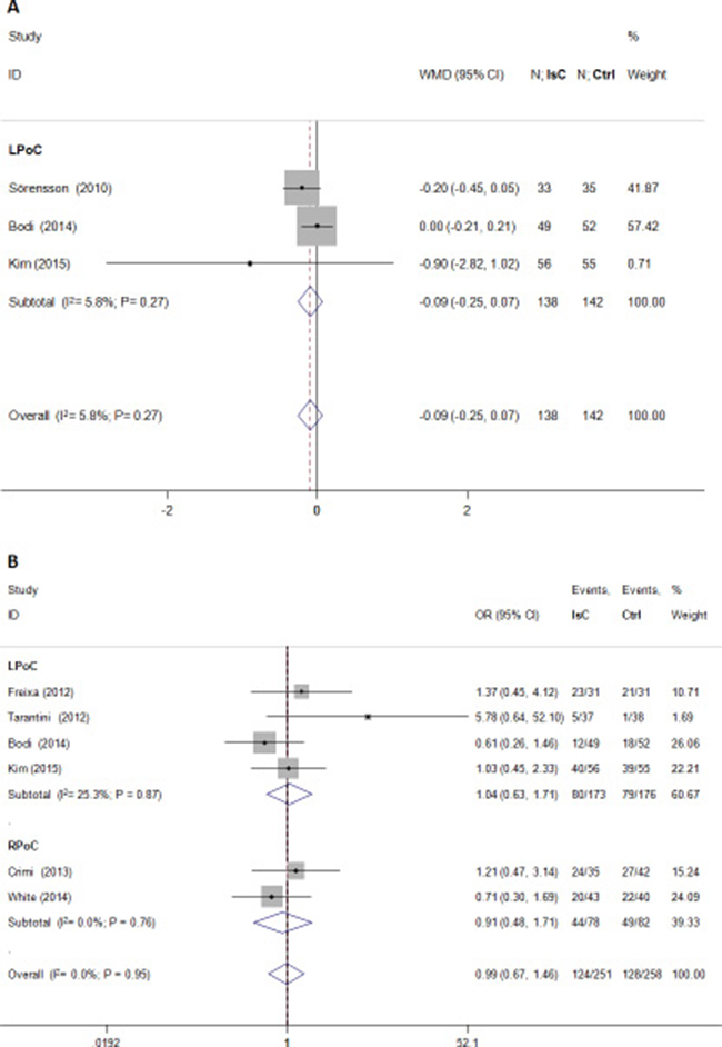 Figure 5: Effects of local and remote ischemic postcondtioning on microvascular obstruction. Histogram plots show that LPoC and RPoC did not reduce (A) extent of microvascular obstruction (WMD = –0.09; P = 0.27) and (B) the incidence of microvascular obstruction (odds ratio (OR) = 0.99; P = 0.95].