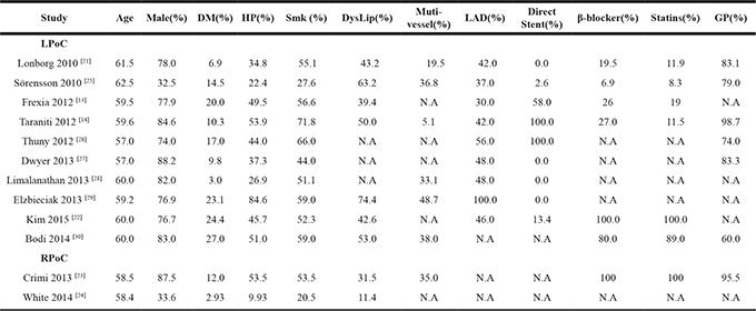 Note: DM, diabetes mellitus; HP, hypertension; Smk, smoking; DysLip, dyslipidemia; LAD, left anterior descending artery; GP, glycoprotein IIb/IIIa inhibitor ; N.A, not available; LPoC, local ischemic postconditioning; RPoC, remote ischemic postconditioning; Ctrl, control.