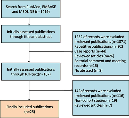 Overall, 1419 studies were identified, 1252 of which were excluded after initial screening. Based on the selection procedures and the criteria described above, we reviewed the full text of the remaining 195 studies. Ultimately, 25 publications which included 9498 patients were considered eligible for inclusion in this meta-analysis (Figure 1).