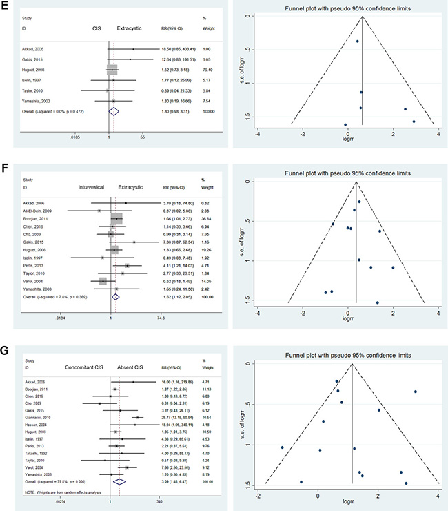 No statistically significant differences were noted when comparing CIS (Tis) with superficial carcinoma (RR = 1.22; 95% CI: [0.56, 2.64]). Similar results were found when comparing CIS versus invasive tumors (RR = 1.73; 95% CI: [0.70, 4.29]), CIS versus intravesical tumors (RR = 1.21; 95% CI: [0.73, 1.99]), and CIS versus extracystic tumors (RR = 1.80; 95% CI: [0.98, 3.31]). No heterogeneity was found among these studies [9–16]. Although insignificant outcomes were tested, CIS was always the greatest common risk factor observed. When comparing UR, statistically significant differences were noted between superficial and invasive tumors (RR = 1.91; 95% CI: [1.12, 3.23]) and between intravesical and extracystic tumors (RR = 1.52; 95% CI: [1.12, 2.05]) [9–15, 17–22]. We found mild heterogeneity in the latter group and moderate heterogeneity in the former (I2 = 52.1%). Therefore, we chose a randomized model to evaluate the risk ratio of superficial versus invasive cancers. Others were tested using a fixed effects model (Figure 2A–2F).