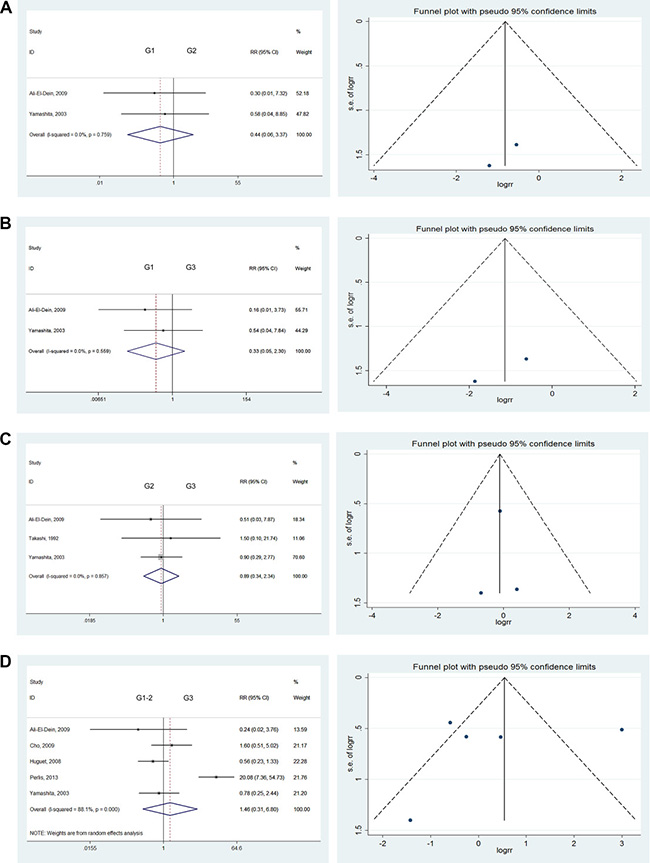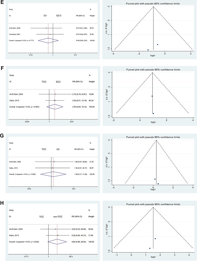 Figure 3: Forest plots and funnel plots of risk ratio for pathological type and clinical grading. The squares indicated the risk ratio (RR), and the horizontal lines indicated the 95% confidence interval (CI) for each included trial; the statistical weight of a trial in the meta-analysis was proportional to the size of each square; diamonds indicate the pooled risk ratio and 95% confidence interval, with the center indicating the point estimate and the left and the right ends indicating the 95% CI.
