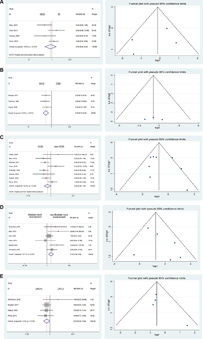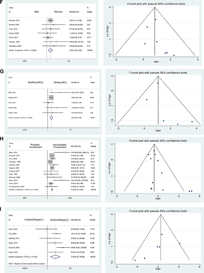 Figure 4: Forest plots and funnel plots of risk ratio for diversion types, bladder neck involvement, node involvement, gender influence, multifocal and solitary bladder cancer, prostate involvement, urethral margin. The squares indicated the risk ratio (RR), and the horizontal lines indicated the 95% confidence interval (CI) for each included trial; the statistical weight of a trial in the meta-analysis was proportional to the size of each square; diamonds indicate the pooled risk ratio and 95% confidence interval, with the center indicating the point estimate and the left and the right ends indicating the 95% CI.