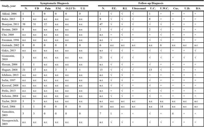 B.S. = bone scan; Cus. = cystourethroscopy; N = numbers of patients; n.r. = no reported; O.LUTS = obstructive lower urinary tract symptoms; P.E. = physical examination; P.M. = penile mass; R.I. = radiologic imaging; U.C. = urethral cytology; UD = urethral discharge (urethral bleeding/purulent); U.D. = urethral dynamic; U.I. = urinary incontinence; U.W.C. = urethral washings cytology; “√” = Yes; “×” = No.