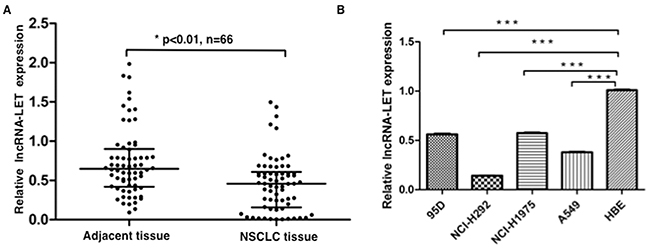 Figure 1: lncRNA-LET expression is downregulated in NSCLC tissues and cell lines. (A) The expression levels of lncRNA-LET were measured by qRT-PCR in NSCLC tissues and adjacent normal lung tissues (n=66), and (B) in four NSCLC cell lines and normal human epithelial cell (HBE). GAPDH gene expression was used as normalization control. Data are shown as mean ± SD from three independent experiments. ***P<0.001.