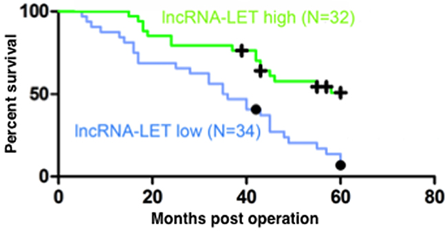 To evaluate the correlation between the expression levels of lncRNA-LET and the prognosis of patients with NSCLC, the 66 NSCLC patients were divided into a high lncRNA-LET expression group (n=32) and a low lncRNA-LET expression group (n=34) using the median as the cut-off value based on the lncRNA-LET expression levels obtained by qRT-PCR. The Kaplan–Meier survival analysis and log-rank tests showed that the 5-year overall survival rate was less than 15% in the low lncRNA-LET expression group but increased to more than 50% in the high lncRNA-LET expression group (Figure 2), indicating that decreased lncRNA-LET expression was associated with negative prognosis of NSCLC patients. To confirm this finding, we further analyzed the correlation between lncRNA-LET expression levels and clinicopathological features in these NSCLC patients. As shown in Table 1, patients with low lncRNA-LET expression had poorer differentiation degree, greater lymph node metastasis and higher TNM stage than those with high lncRNA-LET expression, but there was no significant correlation between the expression levels of lncRNA-LET and gender or age. Multivariate analysis demonstrated that a low expression level of lncRNA-LET was a significant predictor of subsequent metastasis (Table 2). Overall, these data suggest that Low lncRNA-LET expression was associated with the clinical progression of human NSCLC, and lncRNA-LET might serve as a predictive biomarker for NSCLC patients.