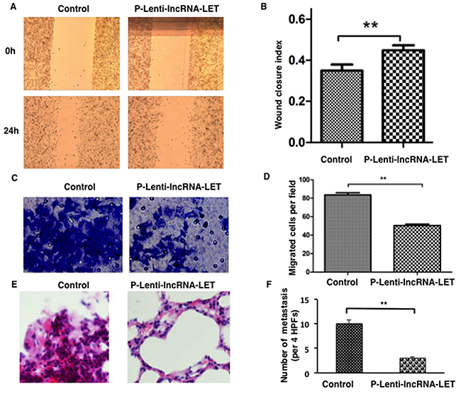 Figure 3: Overexpression of lncRNA-LET inhibits migration and invasion of NSCLC H292 cells both in vitro and in vivo. NSCLC H292 cells infected with lentivirus expressing lncRNA-LET (P-Lenti-IncRNA-LET) or empty vectors (control) were used in the experiments. Representative images are presented on the left and the histograms for statistical analyses on the right. (A), (B) Wound healing assays were used to assess the migration ability of the cells. (C), (D) Transwell assays using the Matrigel invasion chamber were employed to examine invasion capacities of the cells. (E), (F) Histological analysis of the numbers of lung metastases in nude mice that received intravenous tail injections of control or lncRNA-LET overexpressing H292 cells. E. H&E stained sections of lung tissues with metastasis. F. The numbers of metastases were counted and analyzed. Data are presented as the mean ± SD of 6 mice per group. HPF, high power field. ** P<0.01.