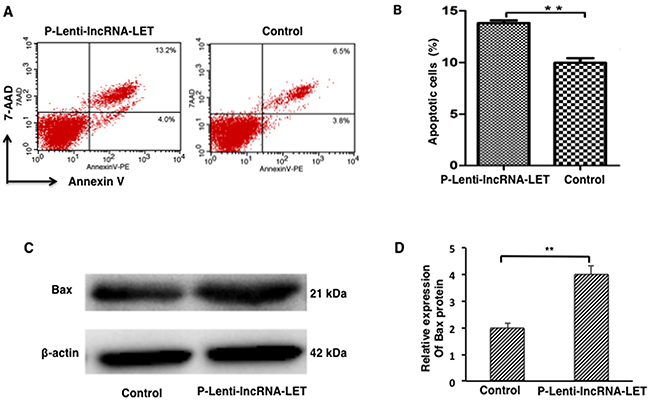 Figure 4: lncRNA-LET overexpression leads to apoptosis of NSCLC H292 cells. NSCLC H292 cells infected with lentivirus expressing lncRNA-LET (P-Lenti-IncRNA-LET) or empty vectors (control) were used in the experiments. (A) Representative dot blots of flow cytometry to assess cell apoptosis after Annexin V/7-AAD staining. (B) Apoptotic cell percentages of total cells by flow cytometry. (C) Expression of apoptotic factor Bax protein by Western blotting. (D) Bax quantitation obtained from densitometry analysis of the blots after normalization to β-actin. Data represent the mean ± S.D. from three independent experiments. **P<0.01.