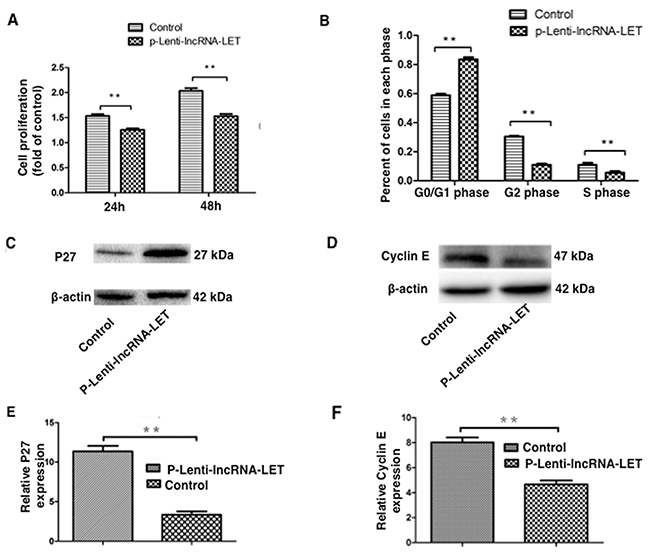 Figure 5: lncRNA-LET overexpression suppresses NSCLC H292 cell proliferation by inducing cell cycle arrest. NSCLC H292 cells infected with lentivirus expressing lncRNA-LET (P-Lenti-IncRNA-LET) or empty vectors (control) were used in the experiments. (A) H292 cell proliferation was measured by CCK-8 assays at indicated times. Data are presented as the mean ± SD of three independent experiments. **P<0.01. (B) The percentage of cells in each of cell-cycle phases was determined by flow cytometry. (C), (E) Expression of the G0/G1 arrest marker P27 and (D), (F) G1/S transition marker Cyclin E were measured by western blotting and densitometry analysis. Data represent the mean ± S.D. from three independent experiments (E, F). **P<0.01.