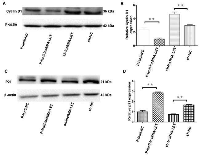 Figure 6: Effect of overexpression or knockdown of lncRNA-LET on expression of cyclin D1 and p21 in NSCLC cells. NSCLC H292 cells were infected with lentivirus expressing lncRNA-LET (P-Lenti-IncRNA-LET) or empty vectors (p-lenti-NC) for gain-of-function experiments. For loss-of-function experiments, H1975 cells were used after transfection with shRNA targeting lncRNA-LET (sh-lncRNA-LET) or control shRNA (sh-NC). Expression of the G1/S checkpoint effector molecule cyclin D1 (A, B) and p21 (C, D) were measured by western blotting and densitometry analysis. Data represent the mean ± S.D. from three independent experiments (B, D). **P<0.01.