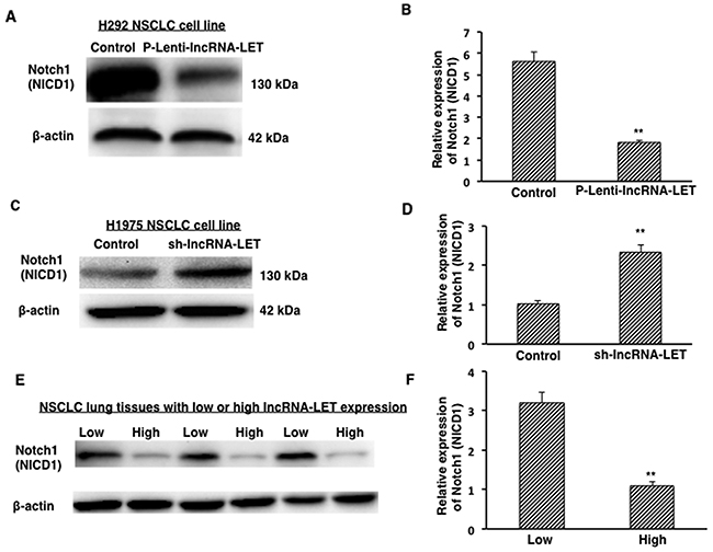 Figure 7: Expression of active form of Notch1 (NICD1) in NSCLC tissues and cells. (A), (B) Overexpression of lncRNA-LET (P-Lenti-IncRNA-LET) reduced NICD1 expression in H292 cells. (C), (D) Knockdown of lncRNA-LET (sh-IncRNA-LET) increased NICD1 expression in H1975 cells. (E), (F) Expression of NICD1 protein from NSCLC tissues with low (n=3) or high (n=3) LncRNA-LET expression levels. Relative NICD1 expressions from densitometry analysis of the blots after normalization to β-actin represent the mean ± S.D. from three independent experiments (B, D), and from ten NSCLC lung tissue samples (F). **P<0.01.