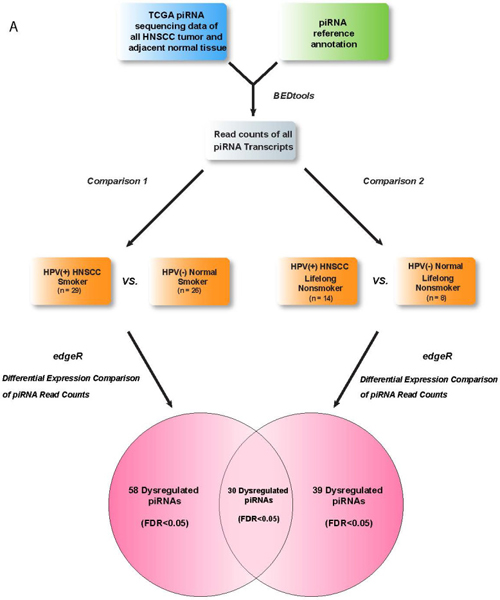 In order to identify HPV-associated piRNAs in HNSCCs, we examined 77 HPV16(+) HNSCC and HPV(–) Normal RNA-seq datasets from TCGA with available clinical data (dataset IDs in Supplementary Table 1). We used negative-binomial based differential expression testing to perform 2 comparisons of piRNA expression between HPV16(+) and HPV(–) cohorts, separately analyzing smoking and nonsmoking datasets as smoking has been suggested to independently alter piRNA expression in HNSCC (Figure 1) [11] . We identified 58 piRNAs to be dysregulated between HPV16(+) HNSCC Smokers and HPV(–) Normal Smokers and 39 piRNAs to be dysregulated between HPV16(+) HNSCC Nonsmokers and HPV(–) Normal Nonsmokers (FDR < 0.05, Supplementary Table 2). The differential dysregulation of piRNAs due to HPV in smoking and nonsmoking backgrounds is displayed in Figure 2.