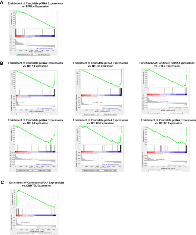 Figure 3: HPV-dysregulated piRNAs display (A) significant positive enrichment relative to PIWIL4 expression, (B) significant negative enrichment relative to RTL gene expression, and (C) significant positive enrichment relative to DNMT3L expression.
